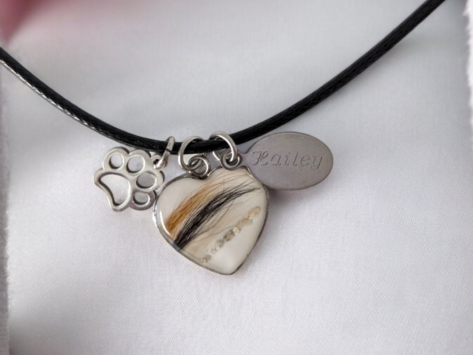 Für die Herstellung des Anhängers benötigen wir eine kleine Haarsträhne (ca. 2 x 2 cm) oder eine kleine Menge Asche. Bei kurzhaarigen Tieren empfehlen wir, die Haare an der Unterseite der Rute zu entnehmen. Sollte überschüssiges Haar übrig bleiben, senden wir es selbstverständlich an dich zurück.